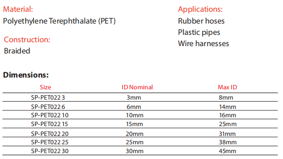SPANDOFLEX PET022 is a protective sleeve made of polyethylene terephthalate (PET) monofilament with a diameter of 0.22mm. It can be expanded to a maximum usable diameter at least 50% higher than its normal size. Therefore, each size can fit to different applications.